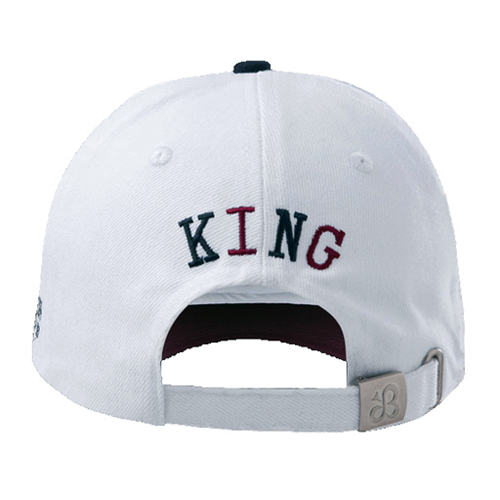 Белая кепка с красным козырьком. Многоразмерная металлическая застежка. Вышивка: индексы KK красного и черного цвета, надпись KING на обороте.